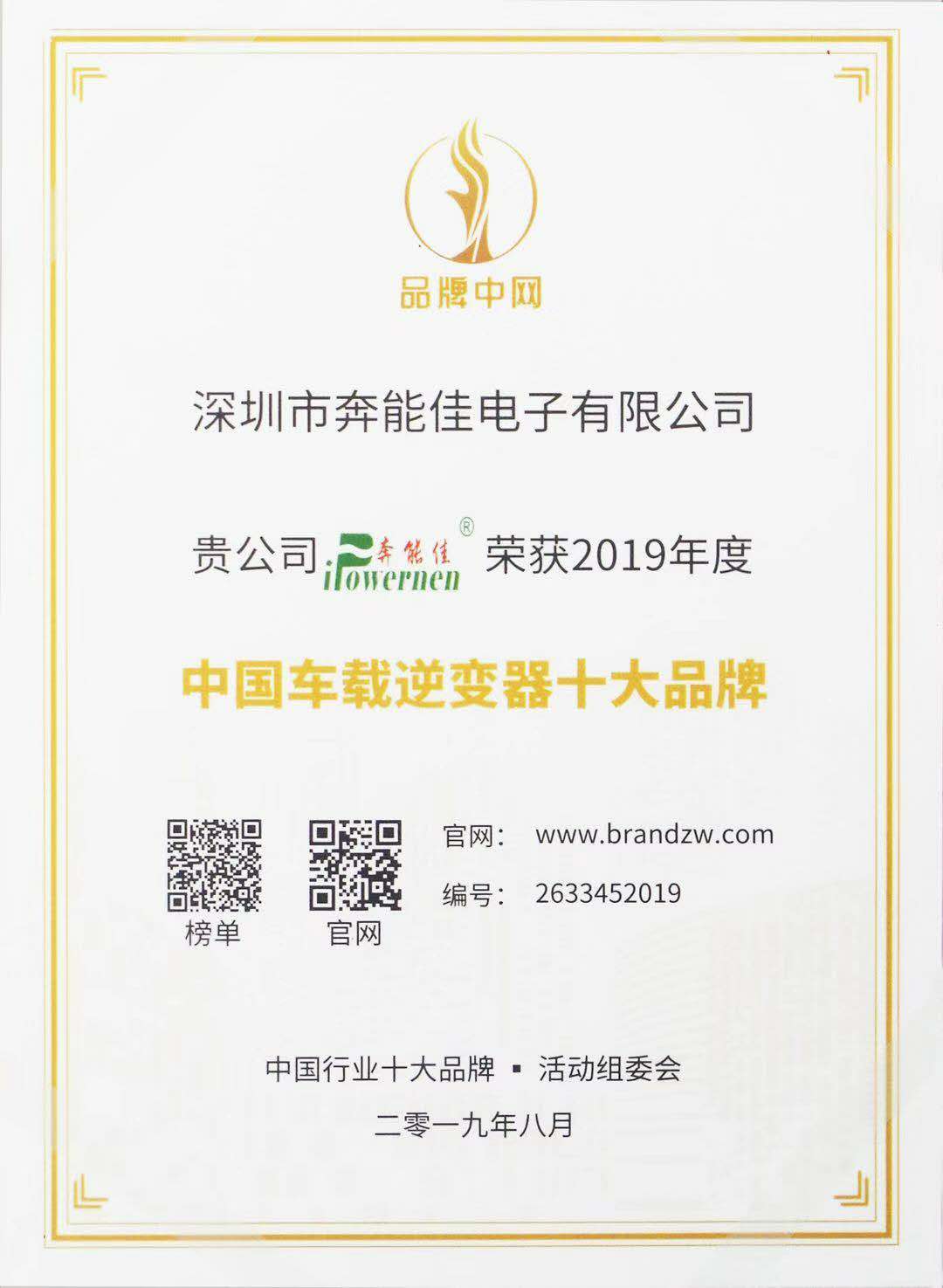 2019年5月26日——8月26日,公司参加了行业协会举办的“中国车载逆变器十大品牌”评选活动!行业内40多家知名企业为获得“中国车载逆变器十大品牌”荣誉,各尽其能,本公司凭借产品品质及在行业内的知名度,不负众望,最终获得2019年度“中国车载逆变器十大品牌”(第四名),实至名归!